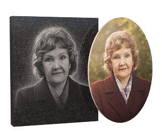На черном граните портрет рисуется непосредственно на камне, а на мраморе и цветном граните портрет не гравируется, не будет видно черты лица. Нужно будет делать вставку или черной гранитной плитки или фотокерамики.